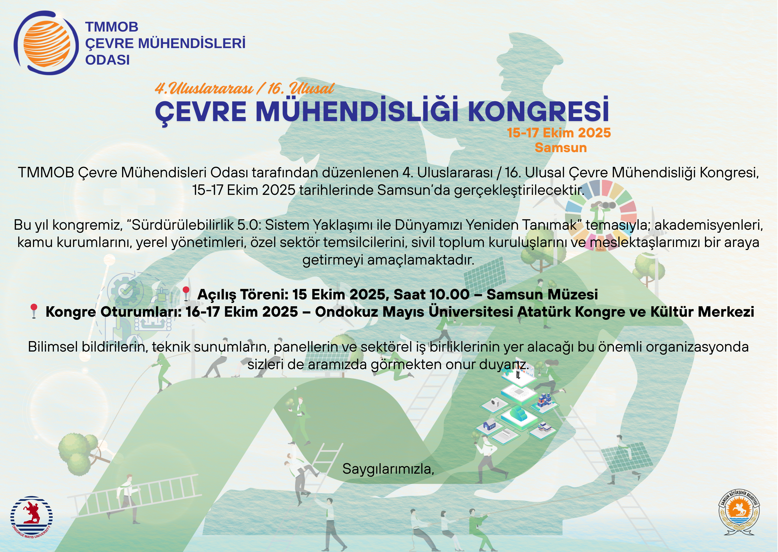 TMMOB Çevre Mühendisleri Odası tarafından iki yılda bir geleneksel olarak düzenlenen Ulusal ve Uluslararası Çevre Mühendisliği Kongresi, bu yıl 16. Ulusal – 4. Uluslararası buluşmasıyla, 2025 yılında Samsun’da gerçekleştirilecektir.